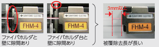 ジャケットリムーバを使用して被覆除去をした際、被覆除去長が規定寸法(3mm)より長いと融着接続機にセットした時に被覆部がV溝に重なり、軸ズレになります。